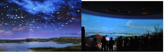 帶著對水洞溝的好奇,坐上大巴,很快見到了傳說中的水洞溝,剛走進大門,看到的是一片荒涼,心中不免有些失望。隨著導游的聲音,走進了水洞溝遺址博物館實景體驗區(qū),我的心情豁然開朗,從繁星點點的蒼穹、裊裊升起的炊煙、成群奔跑的犀牛、鴕鳥、羚羊,到水洞溝人打磨石器、分割獵物、制作鴕鳥蛋皮項鏈,到家園被毀、水洞溝人含淚離開,我們在短短10分鐘內體驗到“夢回三萬年”的情景。一切都是那么真實,那么鮮活,仿佛遠古的水洞溝先民就從我們身邊緩緩走過。